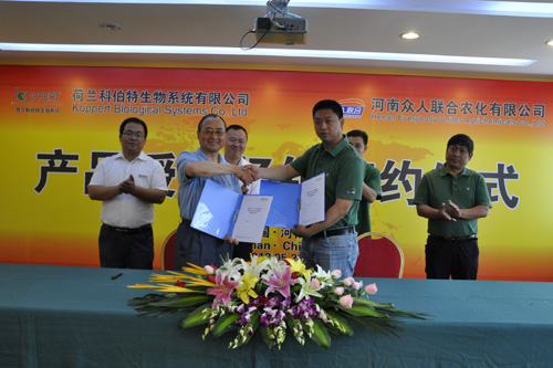 2012年5月,荷蘭科伯特生物系統(tǒng)有限公司與河南眾人聯(lián)合農(nóng)化有限公司在鄭州舉行合作簽字儀式。眾人聯(lián)合農(nóng)化有限公司將成為科伯特全系列產(chǎn)品在河南省的總代理。科伯特中國和眾人聯(lián)合農(nóng)化的領(lǐng)導(dǎo)出席了簽字儀式。