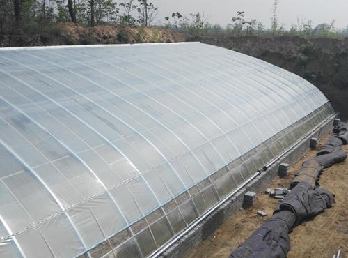 安裝時應(yīng)該選擇無風(fēng)晴天的上午,從骨架前底角處,先覆蓋1.5m的薄膜,下部留750px寬,以備埋入土中固定,東、西方向拉緊膜后,用卡簧卡在山墻的卡槽內(nèi)固定,將下部埋在土中。然后用同樣的方法,將中間的那塊大膜東西向拉緊,下方壓在下面的薄膜上,重疊750px,將2塊薄膜的活動側(cè)每隔3-4m用細(xì)鐵絲固定在骨架上。最后覆蓋最上面幅寬1.5 m 膜,使其下邊與中間薄膜重疊30 cm。鋪設(shè)薄膜后用專用壓膜線在各骨架間進(jìn)行壓膜、固定。這樣覆膜工作也就完成了。