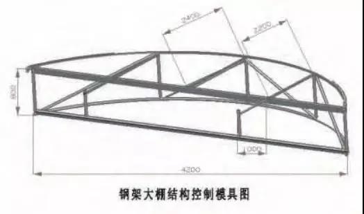 模具制作 用 L50 mm×50 mm×5 mm 角 鐵將平面每隔 3 厘米切割至立面,按拱長 8.1 m,頂高2.4 m,腰高 2.2 m,口寬 4.2 m,制成半拱圓形,用鋼管加固連接,并焊接高 80 cm 的支架,并在模具脊、肩部安裝卡管鎖扣,在下口腰部焊接長 1 m“T”擋桿。鋼架大棚結構控制模具如圖 1 所示。